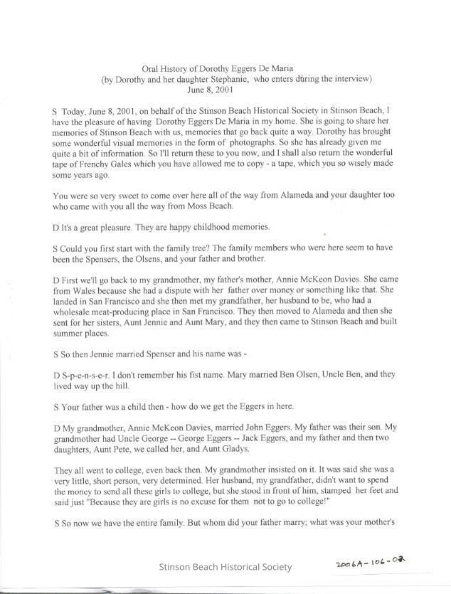 Dorothy runs down her family history and those who settled in Stinson in the early 1900s. She recalls her childhood summers in Stinson: freedom on the beach, her first pony, how she and her brother went crabbing on the Lagoon and sold bait to fishermen, and her time at McKennon's when Mabel served tea and played piano. She talks about Frenchy Gales and BBQs on Bolinas Beach.Collection
