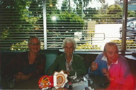 Mildred Sadler sits between Persis Norton (L.) and Carol Mancha in a both at Denny's Restaurant. There is a colorful oriental-looking object or card on the table in front of them. Behind them is a venetian blind-covered window with a view to the outside of greenery, a metal railing and probably a parking lot.Collection