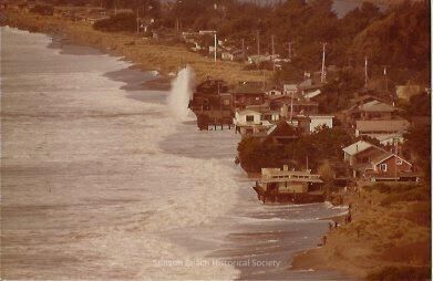 Overhead view of waves crashing up onto the beach and against beachfront houses. Water rushes up to the "castle" house is in the foreground, while further down the beach a large waves causes a geyser effect against (possibly) the White/Reuter house. Some houses in the Patios can be seen behind the dunes.Collection
