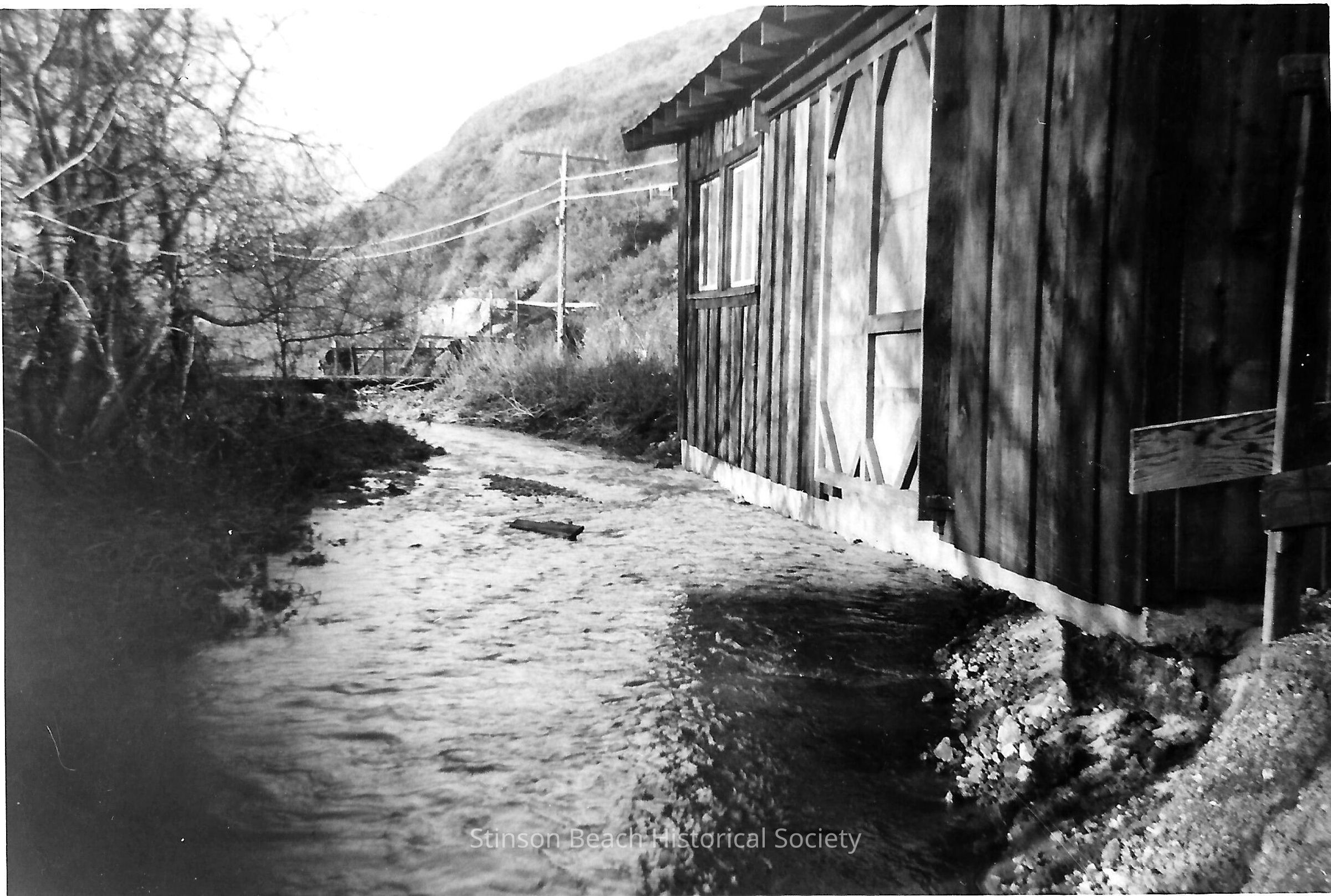 Water rushes by a structure that could be a dwelling. I looks like Easkoot Creek because of the banks with trees on one side and flootbridge in the distance. There is also a telephone pole and a string of wires that connect to a distant pole barely visible that could be along Shoreline.Collection