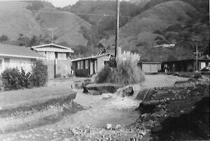 It is difficult to tell where this is but in the center is a telephone pole set amongst Pampas grass around which streams water essentially creating an island in what I presume was the road. Surrounding this mini-island are several houses with the hillside sloping behind them.Collection
