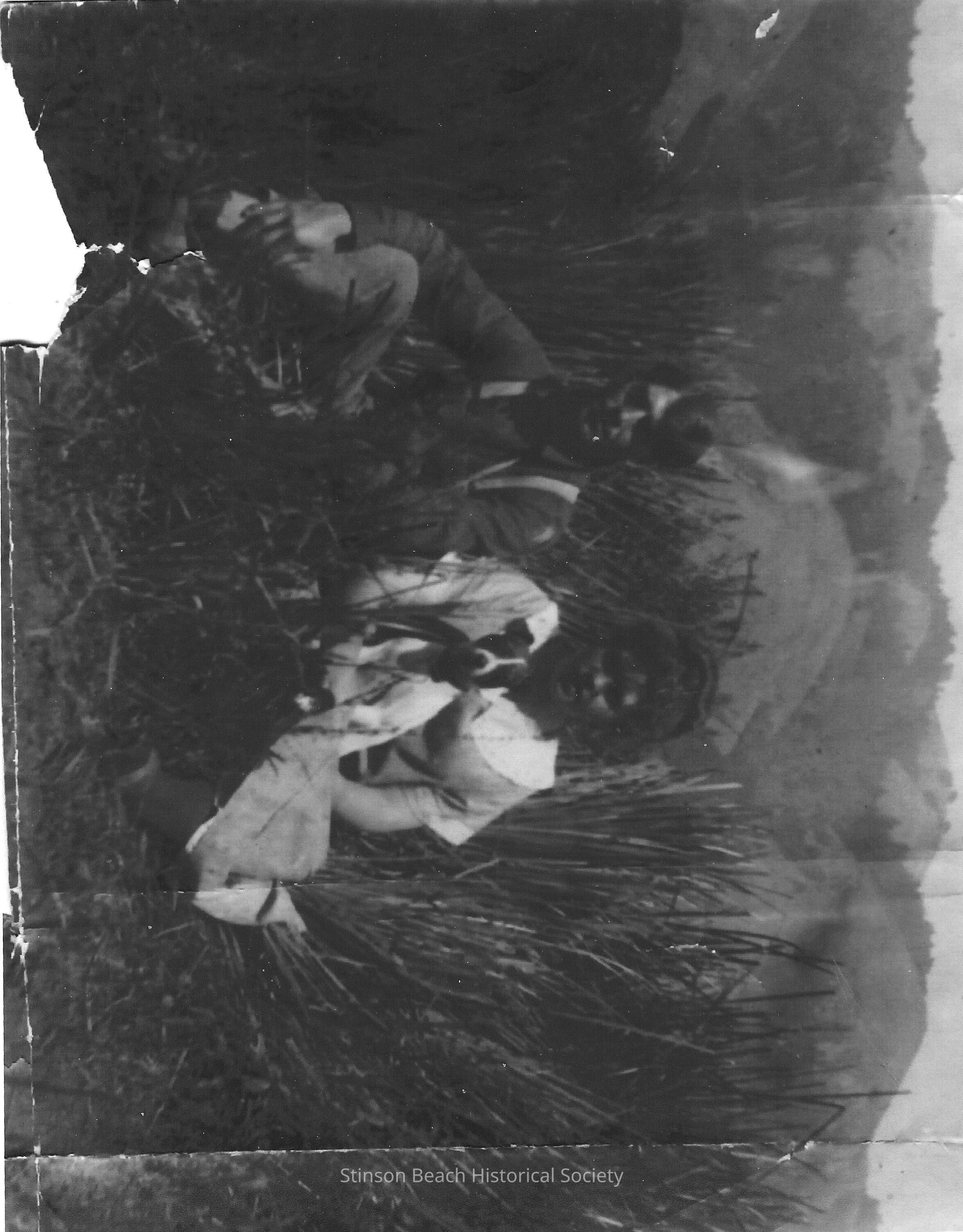 Frank & Lyda (Copland) Pereira (originally Pereira-Azevedo) in Stinson Beach on honeymoon in 1911. They appear to be sitting in the dune grass with their dog on her lap and a view of the hills behind them. Note on back of photo states one brother was a Pereira and 4 brothers were Azevedo.Collection