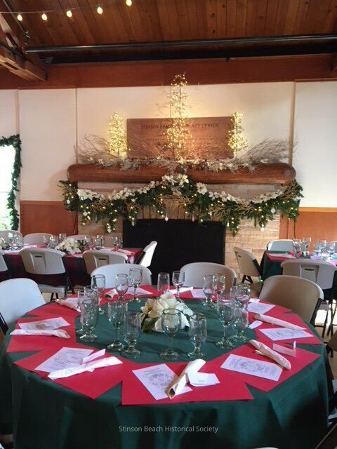 A color photo of a round table set in front of the fireplace. The table cloth is forest green and the placemats are red. The fireplace in the back is decorated with three lit glass trees on its mantle top and with green and white bow in front of the firebox. There are 2 other tables visible on right and left of the subject table.Collection