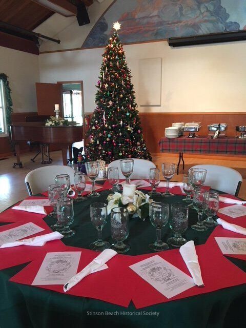 A table with a decorated Christmas tree behind. The piano and the serving station table can be seen in back left and right. There are 4 chairs at the back of the table.Collection