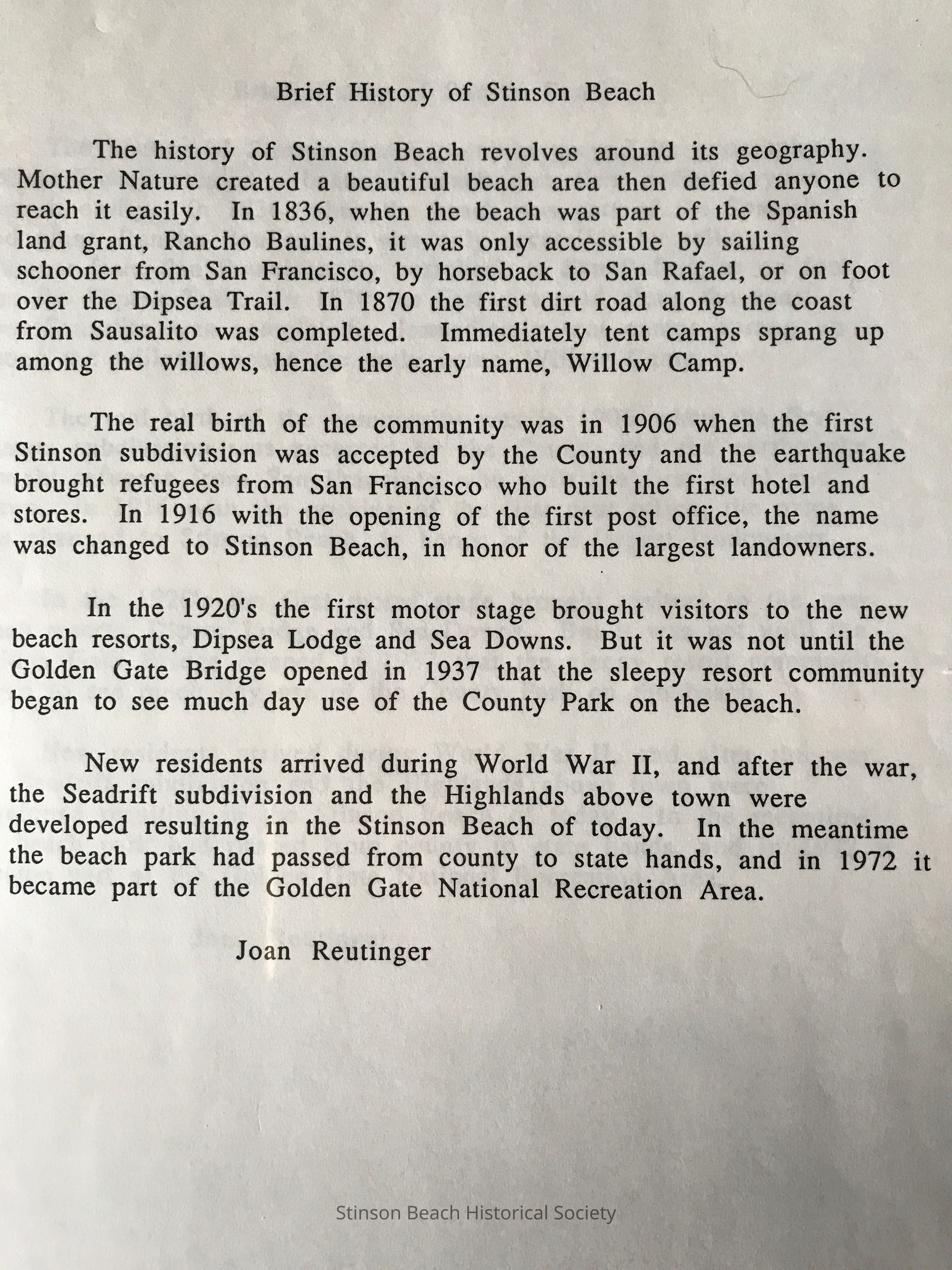 History of Stinson Beach by Joan Reutinger, no dateEntry/Object ID