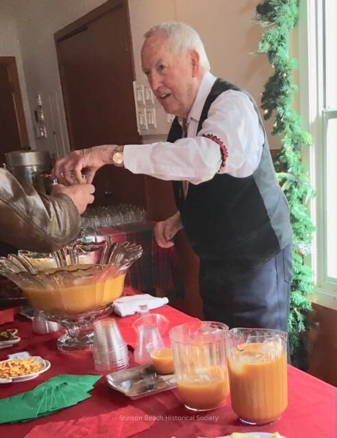 Al Engel in his black vest and arm band on his sleeve serves a cup of his famous punch from behind a table, which holds a large punch bowl and a couple of pitchers of punch.Collection