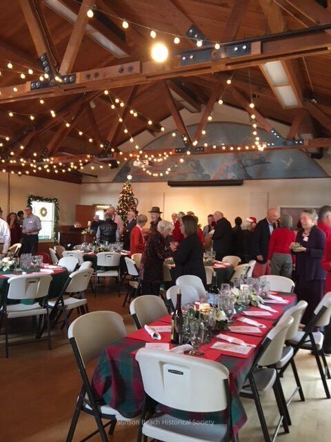 People gather and socialize at the rear of the community. In the foreground the holiday luncheon tables are set. Golden lights are strung from the rafters.Collection