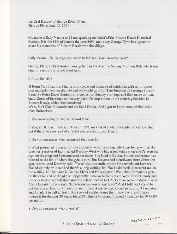George remembers first coming to Stinson in 1963 on the Sunday Morning Motorcycle Ride and moving here permanently in 1968 as an intern. He reminisces about his many patients over the years who he treated for free or in exchange for "services." He describes the original SB ambulance crew and his friendship with Col. White. He recalls Elwoods, "Friday" and Jack Richardson among others. He expresses his love for Stinson Beach and his ranch in Elko, NV.Collection