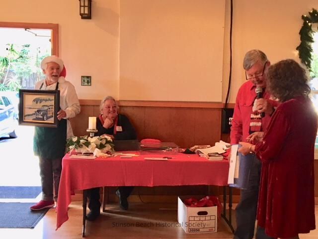 Marcus White, with the help of Susan Kelly, calls out the winning ticket for the raffle prize - a Jon Francis painting held by a volunteer, Stephen Martin. A happy Celeste Laprade sitting at the table by the door looks on.Collection