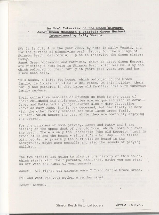 Janet describes how she inherited the property as a wedding present and they began building their home in 1936 using a lot of beach wood and river stone, how it was and is a gathering spot for all the relatives. Patricia recalls days of clamming and camping, the big storms and ambergris. Both recall the sulfur baths, phosphorus in the water, and their parents conribution to the building of the Church and Community Center, and the summer camp for girls their mother held at their home.Collection