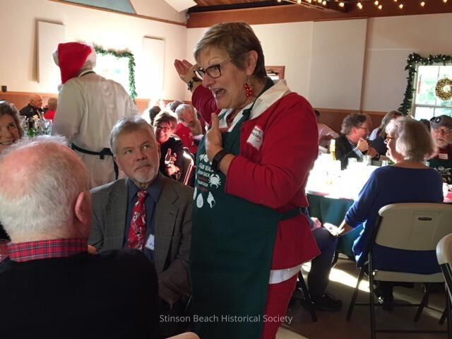 Barbara Wechsberg dramatically expresses herself to two seated gentlemen at the holiday luncheon. She is wearing a dark green Stinson Beach apron over a festive red sweater. Catherine White is seated at a table behind her.Collection