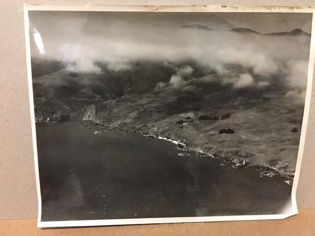 This black and white photograph is taken from airplane flying along the coast. The photo is centered on the Slide Ranch with its buildings as the white spots on the center. The rocky beach and ocean extends from near Steep Ravine in the north down toward Muir Beach. You can see the Ranch's driveway coming down from the Highway1.Collection