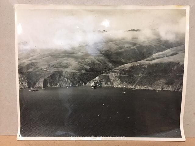 This black and white photograph is taken from airplane flying along the coast. The photo is centered on the north of Slide Ranch. The rocky beach and ocean extends from near Steep Ravine. You can see Highway 1 making a deep U and coming out along the ocean going toward Steep Ravine.Collection