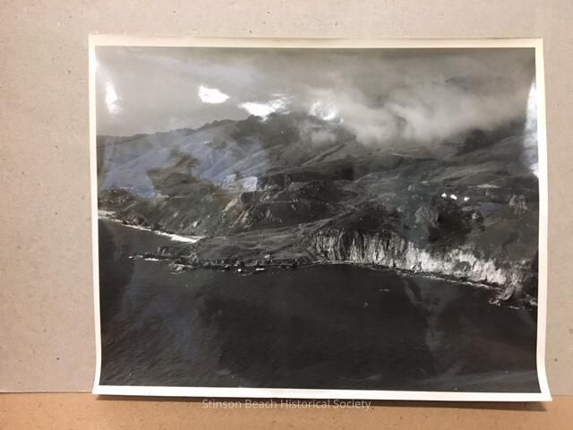 This black and white photograph is taken from airplane flying along the coast. The photo is centered on the Steep Ravine site of cabins. The rocky beach and ocean extends from the south end of the Stinson Beach past Steep Ravine cabins and toward Slide Ranch. You could see Highway 1 weaving in and out along the hills. On the back of the photo has stamped logo of Fred Mae Aero Photos and For Additional Copies of this Photo Refer to Neg. No.9.Collection
