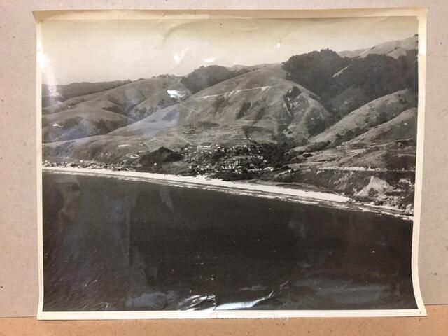 This aerial photograph of Stinson Beach is centered on the cluster of houses climbing up the hillside and shows the beach as it stretches from the Calles to the north to the rocks at the south end of the beach. The undulating hillside dwarfs the town.Collection