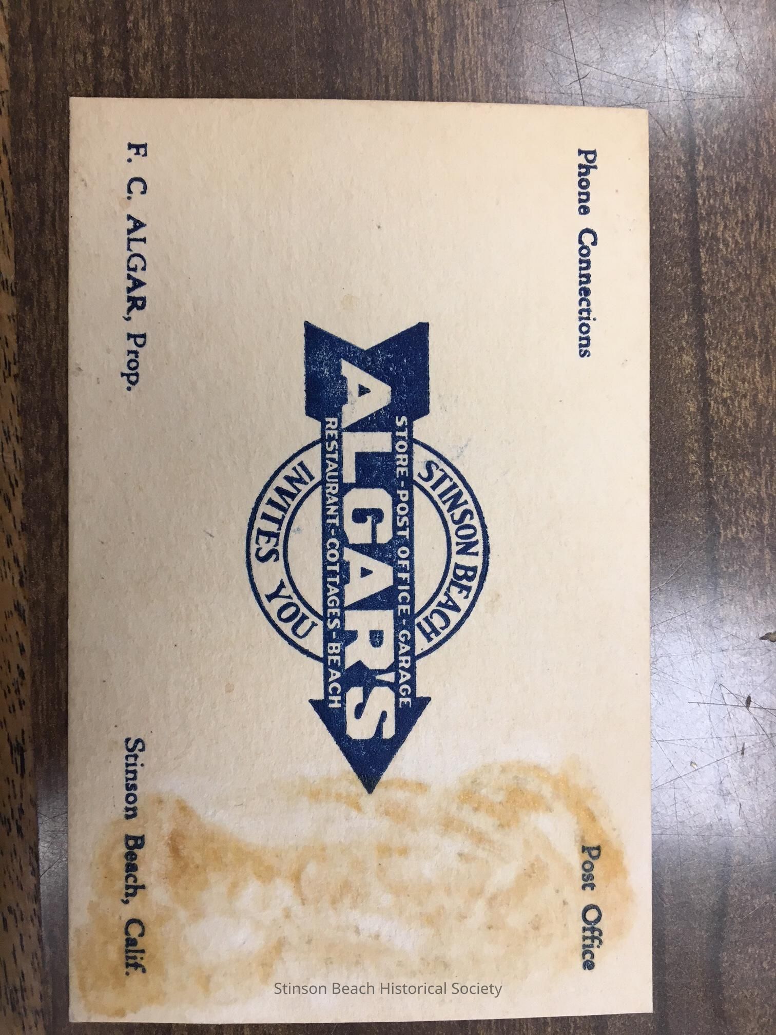 This is a digital photo of Algar's calling card. Algar's was an historical establishment in town. The first official post office of Stinson Beach was housed there. Prior to that it was in the basement of Algar's father-in-law, Lyman Beacher DeCamp. They owned a store where there was the post office, garage, rental cottages and restaurant. His wife, Frances Alice, was the second postmistress following her sister.Collection