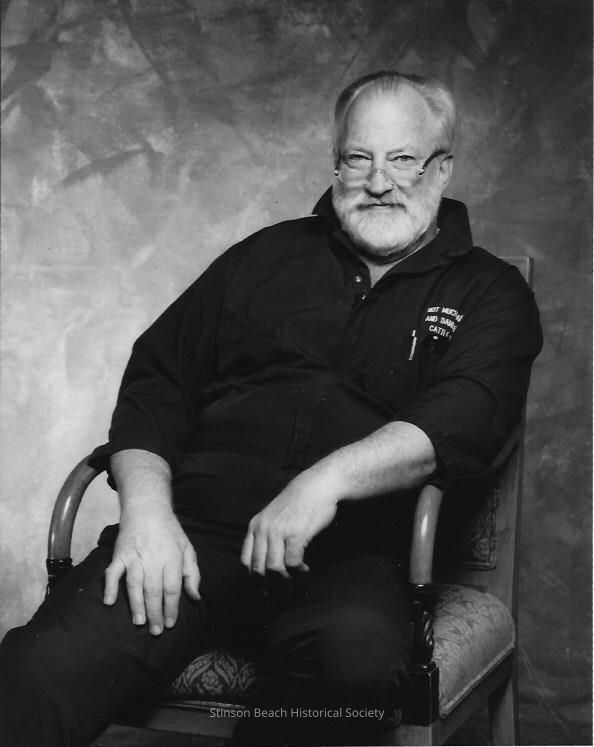 Black & white photo of George Flynn casually sitting in a high-back dining table-type chair with arms resting on the chairs arms. He is wearing a dark jumpsuit with lettering above the breast pocket but due to wrinkles in material unable to decipher the words. For many years he was "Doc" Flynn to the townspeople, giving medical treatment to whoever needed it. He passed away on April 30, 2018.Collection