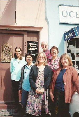 Six librarians stand in front of the old Stinson Beach Library on Shoreline Hwy, next to Oceanic Realty. L to R are: Kerry Livingston, Celeste Woo, Ann Taylor, Dan Carr, Nancy Hemingway and Lynn Murray.Collection