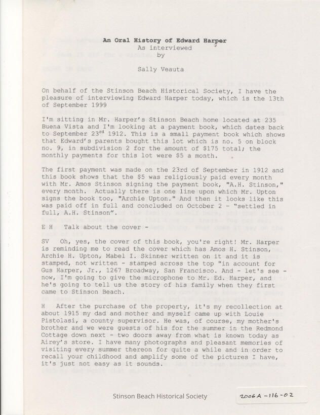 Edward has a payment book dating from 1912 when his father bought a lot for $175 with $5 monthly payments. He then shows photos of early summers spent in SB when it was all pastureland and recalls his childhood swimming and fishing, and barbecues by the Steep Ravine hot springs. At 92, with the 5th generation still coming to town, he describes "old Stinson"-- its "main street," the Laffalot, Poison Pond-- and characters like Pop Robinson, Frenchy and other early residents.Collection
