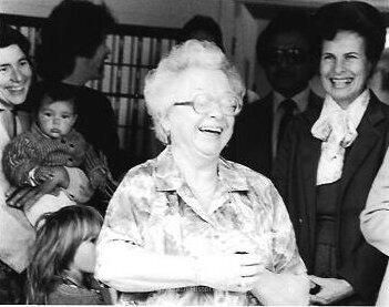 Annie Crotts was Postmistress at the Bolinas Post Office and retired in the late 1980s. Here she is being honored by local residents. Standing just beside her is Gloria Conradi who worked at the Stinson Beach Post Office.Collection