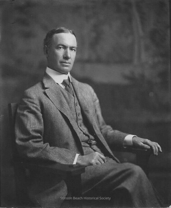 This is a black and white (now more in sepia tone) portrait photograph of William Kent Sr perhaps taken in 1914. He is seated with his right arm resting on the arm of chair. His right hand with half closed fist rests on his crossed right knee. He is wearing a three-piece-suit with white shirt and tie. His left hand rests on the arm of the chair. His dark hair is parted in the middle and he looks straight into the camera. He purchased the sandspit in 1902 with the intention of developing railroad access from Muir Woods to Bolinas and north through Steep Ravine and Stinson Beach Sandspit. See Seadrift History.