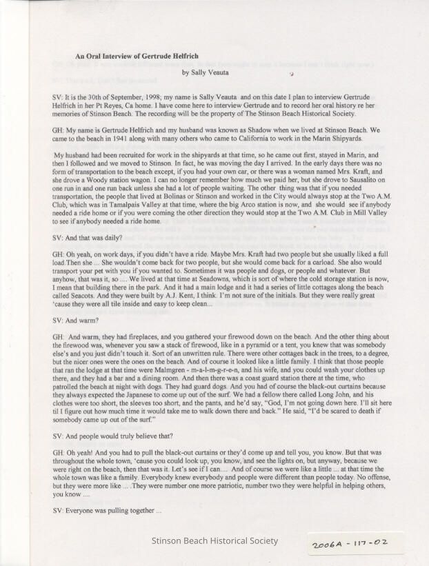 Gertrude remembers coming to Stinson in 1941 and living at Seadowns. She recalls how is was then (family feeling in town) and what kind of over-the-hill transportation they had (the Woody station wagon). She recalls her theatrical experiences in Stinson and the 4th of July bathing beauty contests which raised funds for the Community Center to be built. She describes Stinson in the early days as "slow with a bit of excitement here and there," and how it was during the war years. She describes the businesses back then--and she worked in all of them--like the Surf Club, Christmas outdoors, and the "golden age" of Stinson.Collection