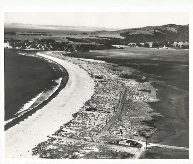 A black and white aerial shot was taken in 1952 by Fred Mae Aero Photo showing the sandspit with the Seadrift Road with street lights. The southern end of the road crosses the Bolinas Lagoon by the causeway. The present Seadrift Realtor building, the gate house perpendicular to the road near, and the "Iron Fence" extending to the ocean can be seen at the end of present day Walla Vista Way. There are 3 houses built facing the ocean. Neither the Seadrift Lagoon nor the Dipsea Road are built yet.Collection