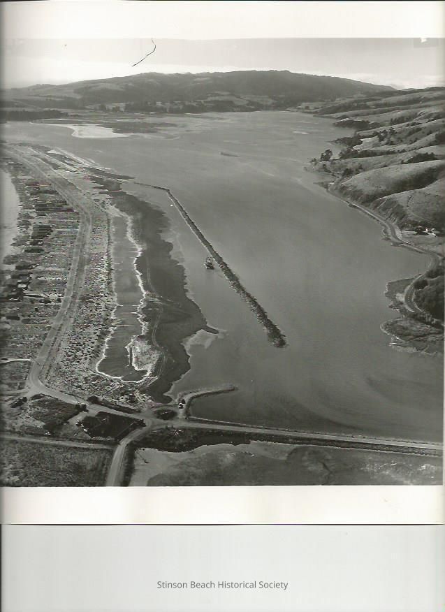 This aerial photo was taken from the south end of the Seadrift development on 8/2/1960. It shows the very beginning of the creation of the Dipsea Road side of Seadrift including the inner lagoon. This part of the inner Lagoon is dredged and the dredged material is piled on the east side of it. The dirt bar is seen to outline the Dipsea Road of the development. The dredge, the Curlew Side-Draft Dredge of the Associate Dredging Co, is seen working on this bar. There are 20 or so houses on the ocean side of the Seadrift Road which continues to the causeway to Highway One. There is a gate perpendicular to the causeway which is different from the present location of the gate. Calle del Arroyo, with Walla Vista Way jutting off to the left, is visible on the lower left of the photo, hills along the lagoon and the Bolinas Ridge completes the photo. On the back of the photo has stamp; AERO PHOTOGRAPHERS