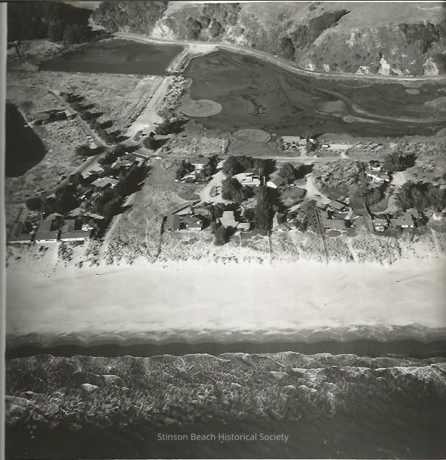 This more detailed photo shows the end of the Patios and the southern end of the Seadrift Development with the tidal gate bridge of the causeway removed. The immediate foreground shows the beach with breakers; beyond that the 5 southern-most Seadrift houses, Walla Vista Way, and houses on Sonoma Patio, Sacramento Patio, and Rafael Patio. Continuing upward and eastward, the photo shows part of Bolinas Lagoon and the south end of Seadrift Lagoon with the broken causeway. The hills along the lagoon appear at the very top. On the back of the photo has stamp: