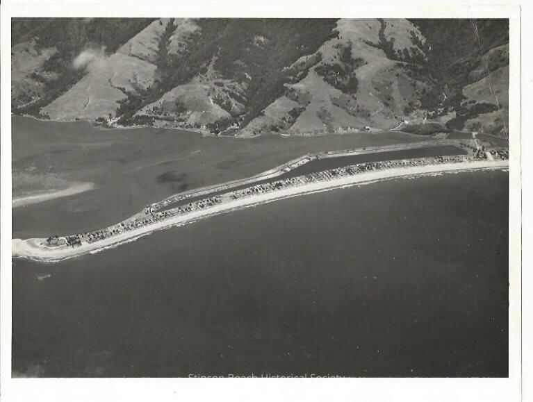 This aerial photo is taken from above the ocean looking at the Seadrift. The Seadrift Lagoon has about 10 homes on the Dipsea Road. Numerous houses are built along the lagoon side of the Seadrift Road. The tennis courts and its club house are visible as is the Bolinas Lagoon and the hills the lie beyond. On the back of the photo has stamp: