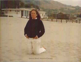 Patty Wilkerson in her younger days, and shortly after her arrival in Stinson, kneels on the beach with various beach houses in the background. She wears a dark sweater and white jeans.Collection