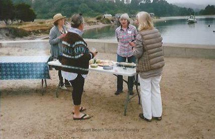 Four women converse around the hors d'oevre table: Lucy Kent Maushardt, Phyllis Fitzpatrick, Susie Nelson, and woman in straw hat. This was a fundraising event for the Historical Society. The main speaker was Lucy Kent Maushardt, a descendant of the Kent family that developed Seadrift.Collection