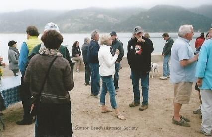People socializing at the Seadrift History event beside the Lagoon. The only identifiable person is David Conrad in black sweatshirt and baseball cap speaking with a blond woman in a white jacket and blue jeans in the center of the photo.Collection