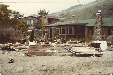 Although this house with its stone chimney appears to be undamaged the debris piled in front of it tells another story. Framing, boards, sandbags and miscellaneous unidentifiable pieces litter the yard. This house belonging to Veal family was eventually destroyed.Collection
