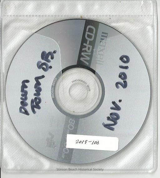 This disk contains 2 folders. One containing 14 photos of west side of downtown Stinson Beach buildings starting from the Store ending at Surf Shop building. the second folder contains 19 photographs of Downtown Stinson Beach buildings standing on the east side of the Shoreline Highway starting from the Healing Arts to the Library building.Collection