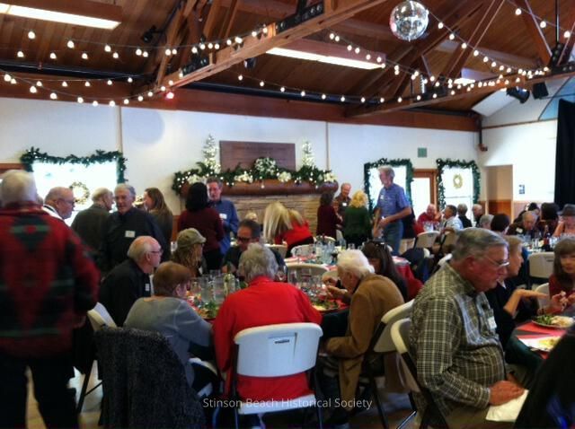 2018 Holiday Luncheon guests, seated and standing, fill the Community Center, which is festively decorated with holiday greenery around the fireplace and windows, and lights strung from the ceiling.Collection