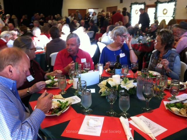 Marcus & Catherine White seated at a round table with Wendy Doughty on the right. Two empty place settings are seen in the forefront, while a multitude of guests lined up at the buffet table fill the background.Collection