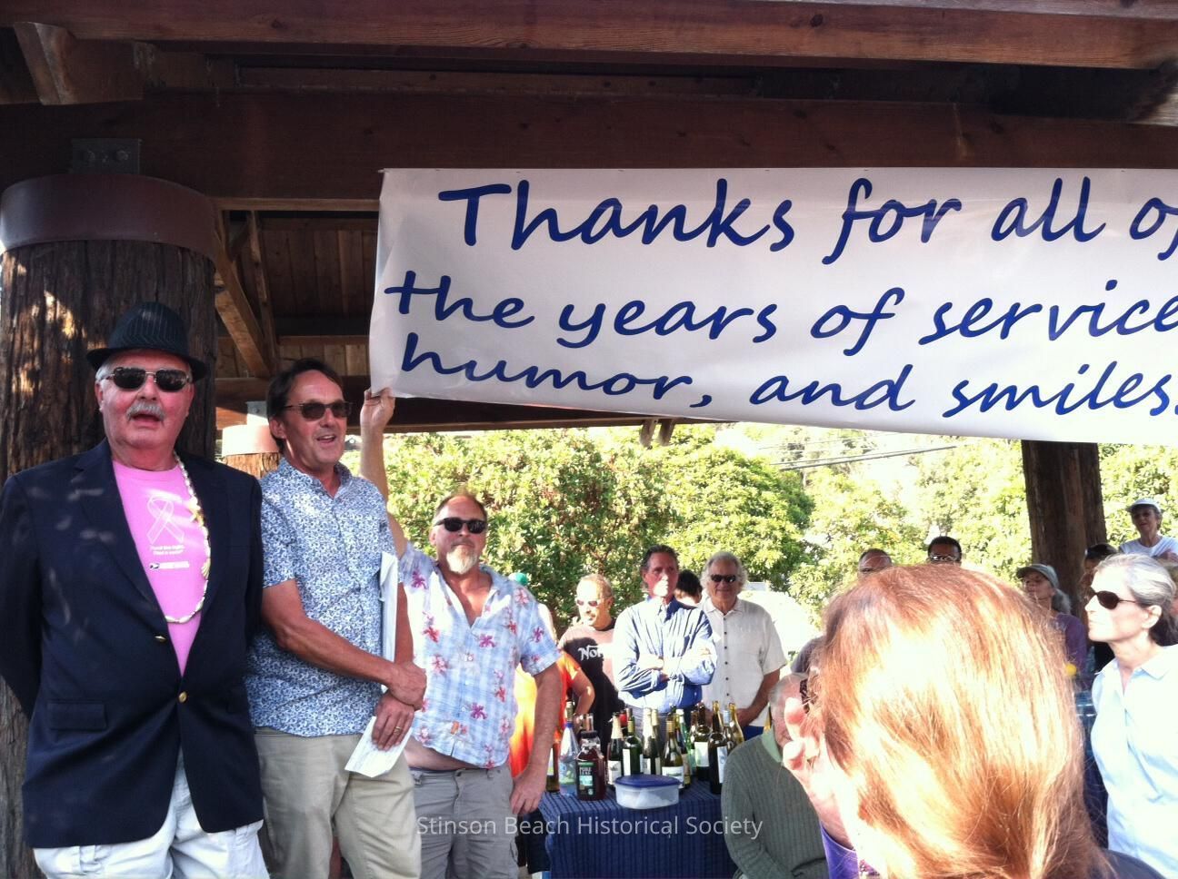 Marcus White, wearing a pink shirt and seashell necklace under a navy blue blazer, plus a fedora and shades, stands next to Jim Harvey in the picnic shelter in Village Green II at the commencement of ceremonies honoring his retirement from the Stinson Beach Post Office. A crowd of people watch as a banner is being hoisted aloft on which is written "Thanks for all of the years of service, humor and smiles." Jim's was one of many speeches given that day to a large and appreciative crowd.Collection