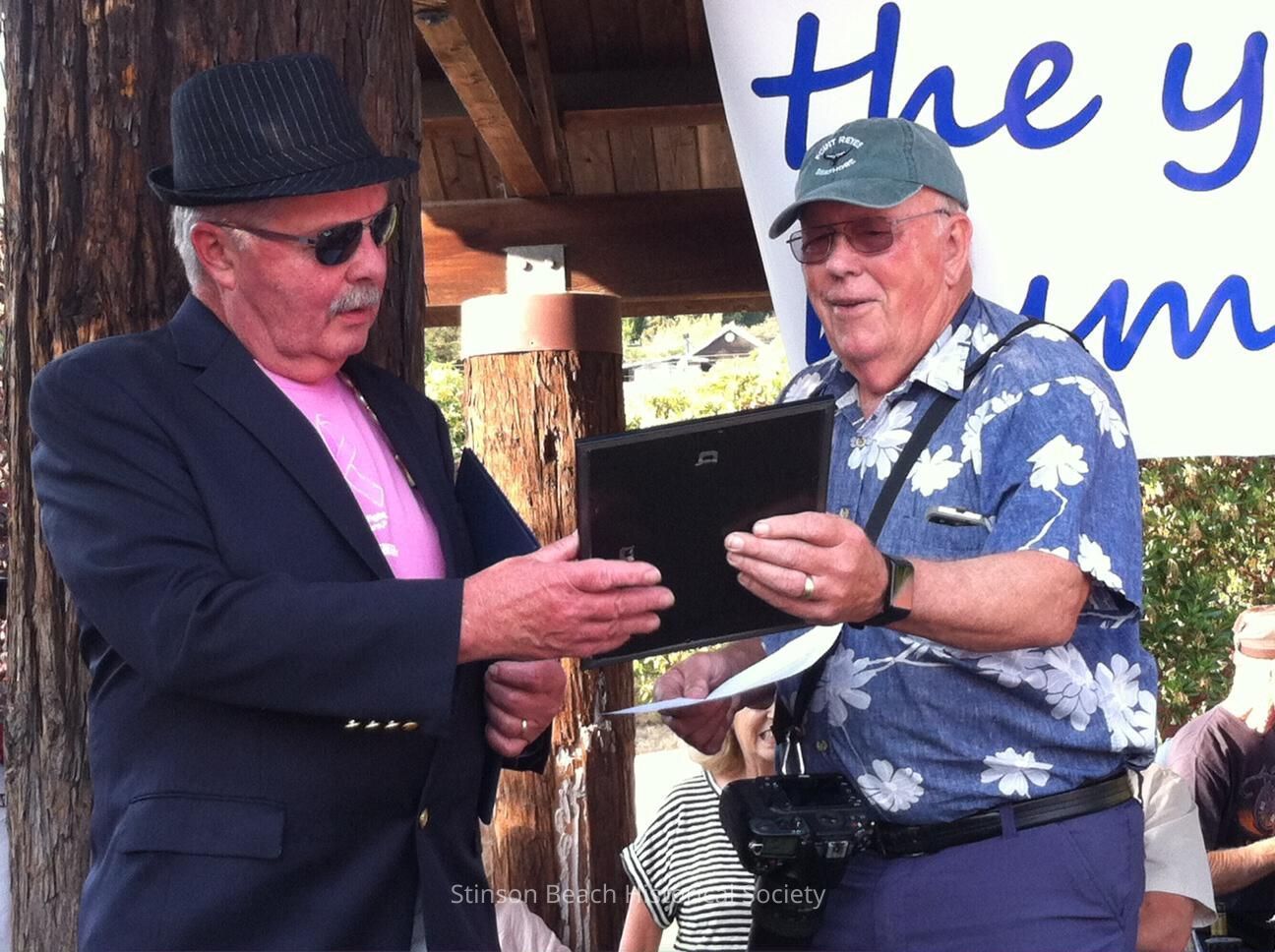 Morey Nelsen presents an honorary plaque to Marcus White at his retirement party. Marcus is wearing a navy blue fedora and blazer over a pink t-shirt. Morey is wearing a blue & white flowered shirt and blue-gray Point Reyes Seashore cap with a camera slung over his shoulder.