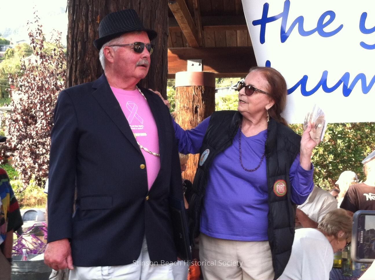 Andrea di Marco made a special trip from Illinois to present Marcus with some mementos from the past when they first became friends during their early days in Stinson. Andrea is wearing a deep lavender shirt with a matching string of beads under a black down vest. They both are wearing Blues Brothers sunglasses.Collection