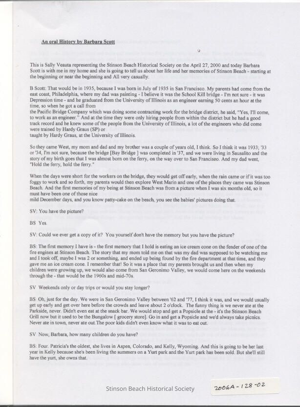 Barbara has been coming to Stinson since infancy with her parents and later from San Geronimo Valley in the 1960-70s with her husband and children. They moved here in 1981 and her daughter Nancy got a job at the Parkside snack bar. After recounting a bit of Parkside history and anecdotes about Mame and Walt, Barb tells of how she bought the Parkside in 1982 after the flood. She recounts being trained by Bobby Stevens and how the Cafe operated as a "hangout" for locals after her son Bill took it over. She speaks of community feeling, people helping people, and her vision of affordable space. She remembers Eli, Matt, Jim and Ian; "holy" Joe, Ben and Peter, Agnes Bone and Lolly Landerbee. She finishes by talking of her creative side, Sharon Rowell, and politics.Collection