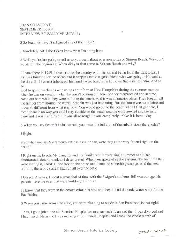Joan first arrived in Stinson in 1949 when she visited Bill Swiegert on Sacramento Patio. In the '60s she and her family spend summers in a house on Calle del Onda. After remarrying in 1970, she and her husband Willis bought a house in Seadrift (which barely survived the storms of '82/'83) but didn't live here full-time until he retired. She recalls old friends and neighbors (Ed McGillicuddy and Proctor Jones).Collection