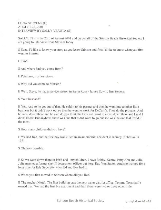 Edna remembers moving to Stinson Beach in 1966 with her husband Jim Stevens and their 4 children and opening a hardware store (at present the location of the Gym). She mentions many ladies she associated with through various organizations; she remembers the anchovie die-off in the Lagoon; and her children Bobby (and his history with the Parkside), Kenny (current Fire Chief of Stinson), Julie (von Savoye) and Patty (di Masi).Collection
