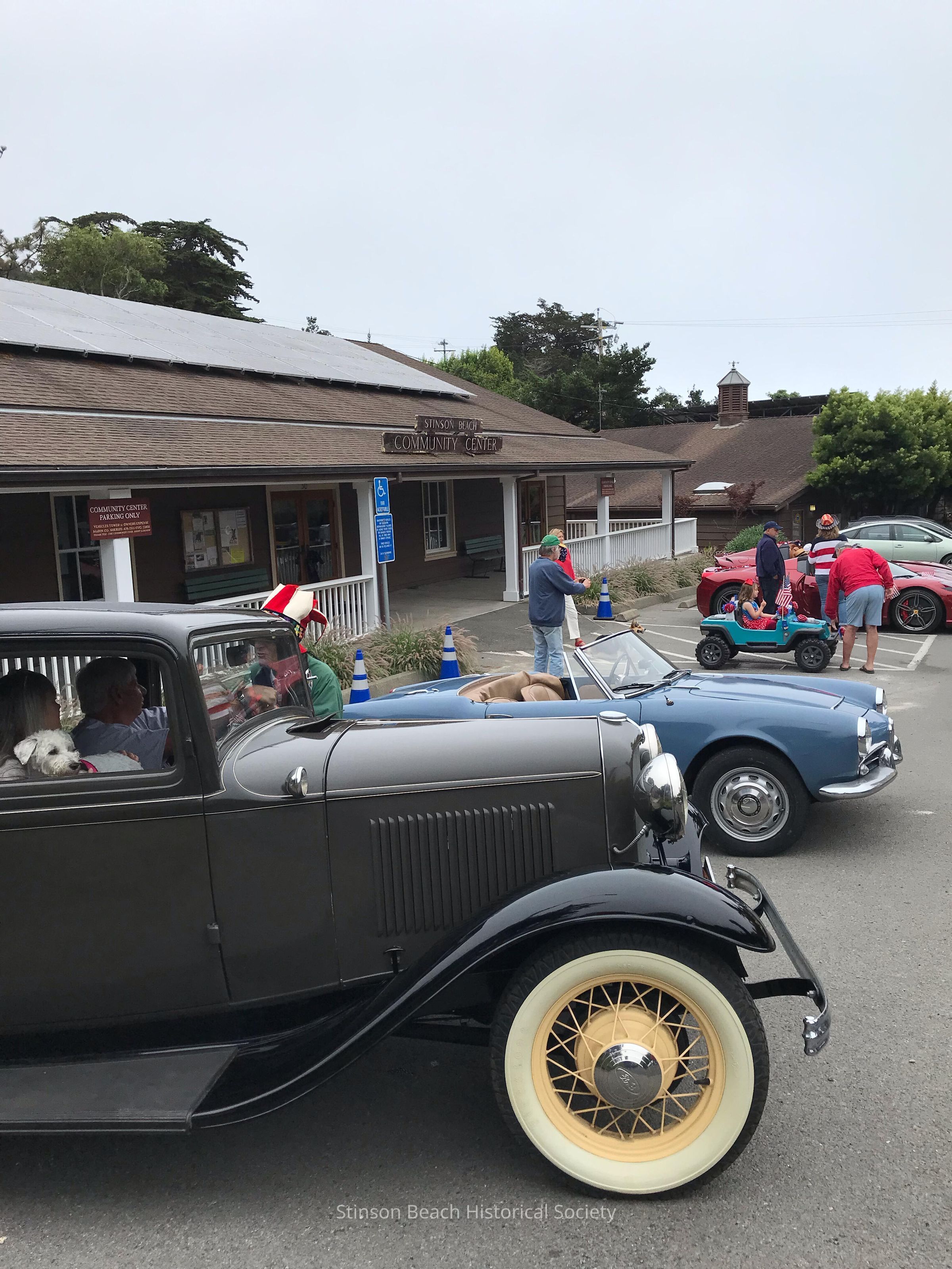 Started in 2020 to bring 4th of July celebrations back to Stinson beach, Toby Bisson and others organized a car parade that started at the Community Center, up Laurel and around the loop, then to Seadrift. Lined up include a 1932 Ford owned by Mike & Sarah Bagley, an Alfa Romeo, mini-jeep, and Ferrari.