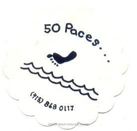 A paper coaster given to lodgers at the "50 Paces..." Bed and Breakfast in 1990. The "50 Paces..." was located at downstairs of 19 Calle del Resaca, just 50 paces away from the beach. It was owned and operated by Barbara Ward for 7 years during 1990s. The white circular paper coaster with scalloped edge has the design and logo of the establishment printed in dark blue: 50 Paces... at the top, a picture of a foot print over 2 scalloped lines indicating the beach at the middle, and at the bottom it's telephone number, (415) 868 0117 is printed.Collection