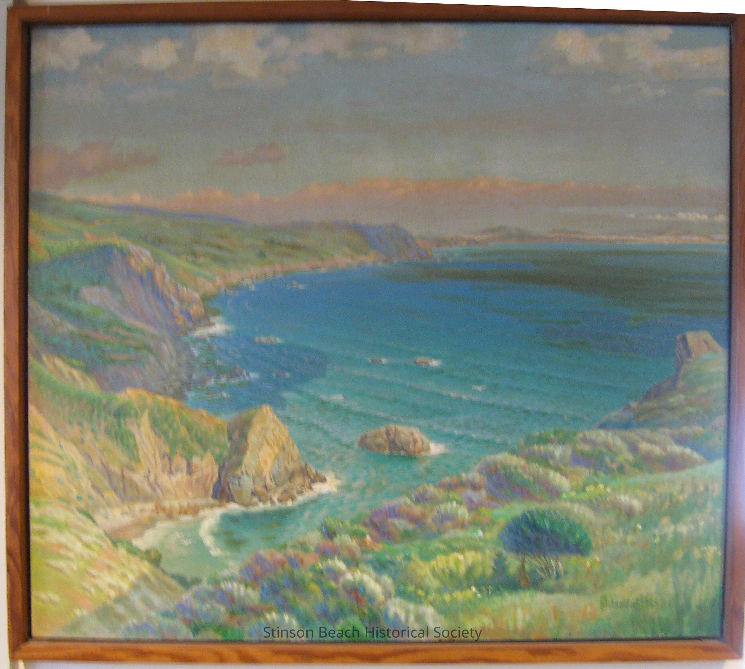 This is a Bruno Schneider landscape. From a scrubby hillside (in shades of green, blue and yellow), above the blue waters and outcroppings of the Steep Ravine cove, the view takes in the extensive coastline toward San Francisco in the distance, which has a pinkish cloud/fog layer suspended above it. Whiter clouds float higher in the blue sky as the fog layer dissipates into the atmosphere. The ocean, more aquamarine in color close to shore, changes to a clear blue and deepens into a shade of sea green the further it goes out.Collection