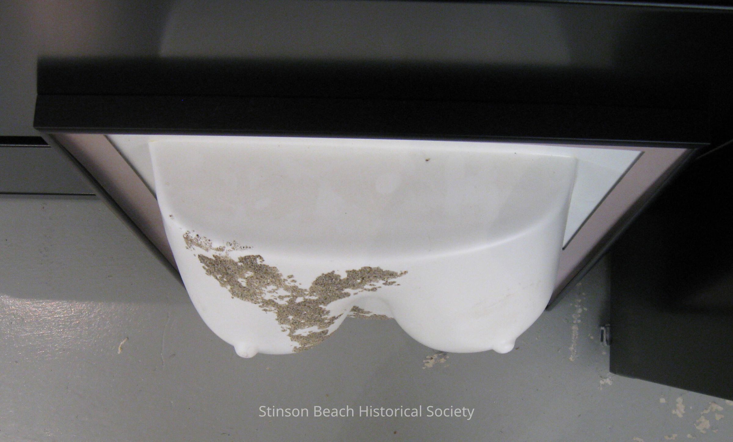 Plastic mold of a pair of female breasts mounted on a mauve board in a gray frame. The breasts, in white, extend 3-dimensionally out from the board. A casual line of sand flows from the left top of the frame, over the left breast, and continues down the board in a braided style until it forks into an upside down V at the bottom. On the bottom of the mold, written in black, is the title "Two Miles of Sand Castles" on the left and the author's name "Nicolino" on the right. In the center he has written 27/80 and March 20 '94. This is one of the many molds of female breasts used by 200 volunteers to create a 1.5 miles stretch of 1500 breasts sculpture casts on Stinson Beach. The artist had framed it and decorated it to commemorate the occasion and to raise funds to fight breast cancer.Collection