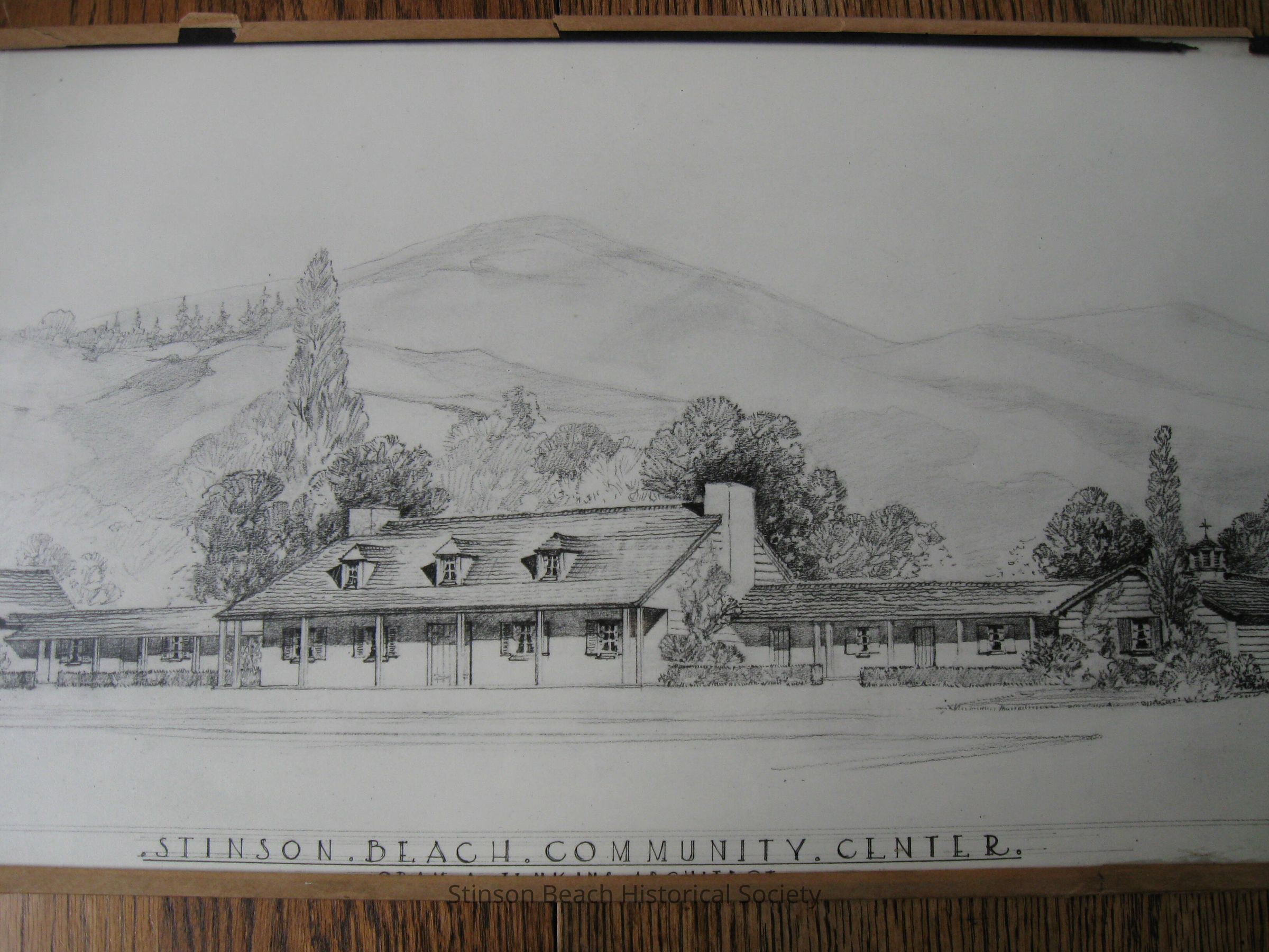 Artist's rendering of proposed Community Center in watercolor and ink, framed with glass. Building sits at base of hillside with relatively dense foliage behind it. Building has a central structure and is flanked by smaller attached additions on either side.Collection