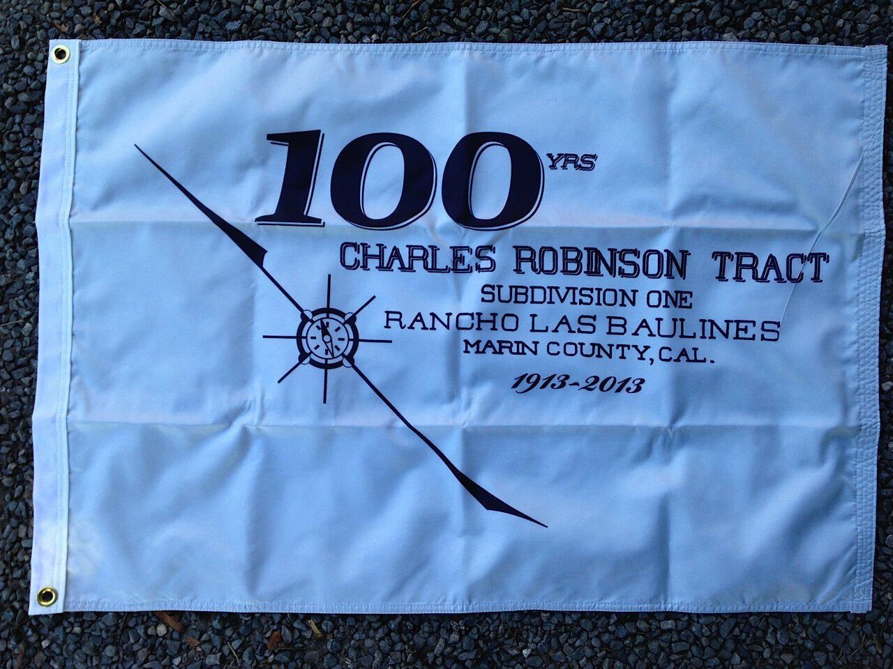 A flag made for the Charles Robinson Tract 100th year neighborhood party. It is 38" long and 26" wide.100years, Charles Robinson Tract, Subdivision one, Rancho Baulines, Marin County, Cal; 1913-2013 is printed on it.Collection