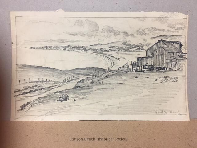 Original Pencil Sketch of White Gate Ranch drawn by Sutton Wood in the 1920s. Mr Wood was a well-known commercial illustrator in San Francisco. The sketch takes in the long view from the ranch barns with resting cattle across the water to the Bolinas headlands.Collection